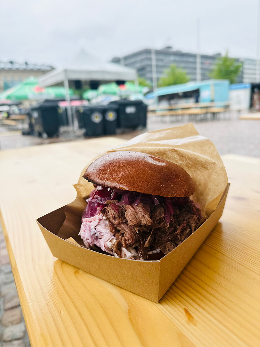 Seuraavaksi nautittiin kalansaalista Kangasniemestä. Eemeli (kuvassa) ja Anni Oksialan ja Tatu Laitisen omistama Fisuburger äänestettiin tänä vuonna yhdeksänneksi parhaaksi burgerimestaksi. Kalaburgerin pihvi oli tehty hauesta ja lahnasta, jonka makuja kehysti hyvin chili-wasabimajo ja fetasalaatti. Jos et ole maistanut hyvää kalahampurilaista, niin tästä kannattaa aloittaa!