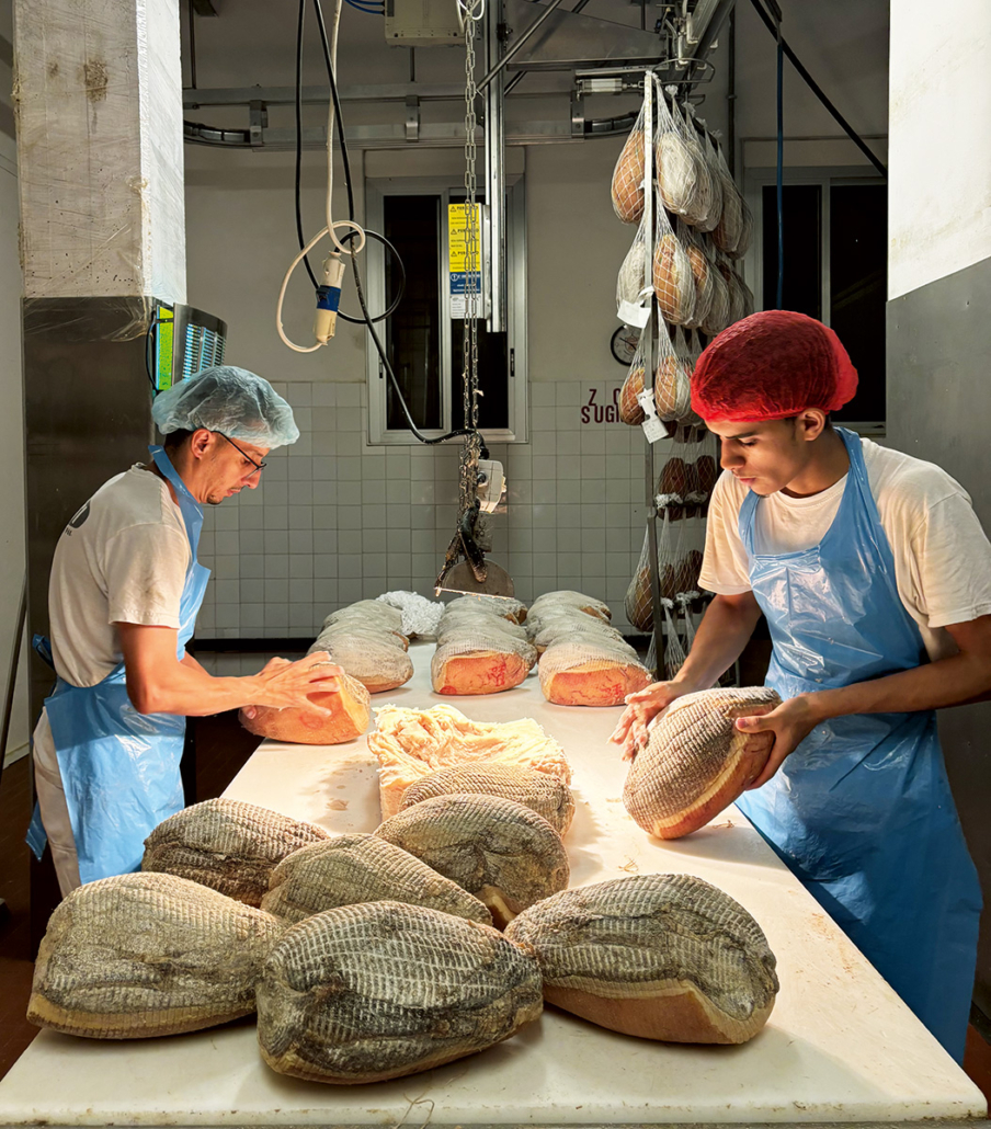 Sugnatori-tiimi työssään hieromassa culataa. Kinkun trimmattu osuus hierotaan laardilla. Hieronta on taitoa vaativaa työtä, ja siihen erikoistuneet työntekijät kiertävät tilalta toiselle hoitamassa kinkkuja. Yksi hieronta vie noin 2,5 minuuttia, ja kinkut, joita aiotaan kypsyttää pidempään, saavat myös toisen kierroksen.