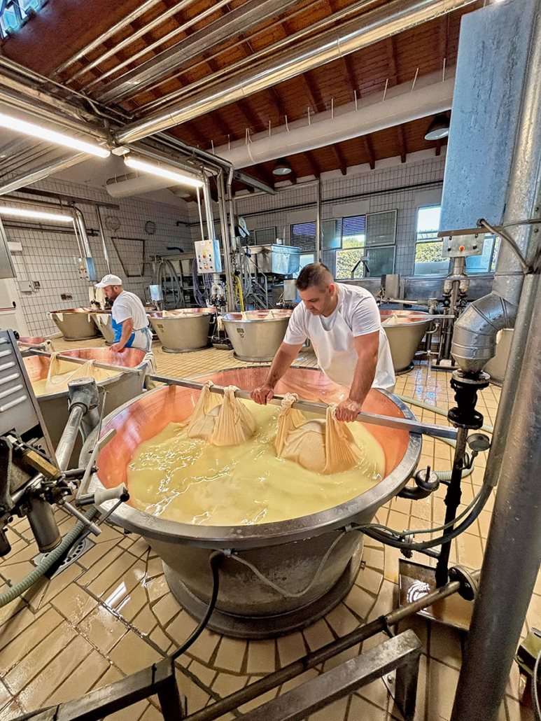 Yhteen parmesaanikiekkoon tarvitaan 520 litraa maitoa. Villa Aiolan juustolassa on 14 upeaa kuparipintaista noin tuhannen litran kattilaa, joissa jokaisessa syntyy parin tunnin mittaisen prosessin aikana kaksoset. Yhden satakiloisen juustokiekon käsittelyn sijaan juustomestari puolittaa kiekot ja joka kattilasta saadaan näin kaksi 50-kiloista parmesaanikiekon aihiota kypsytettäväksi.
