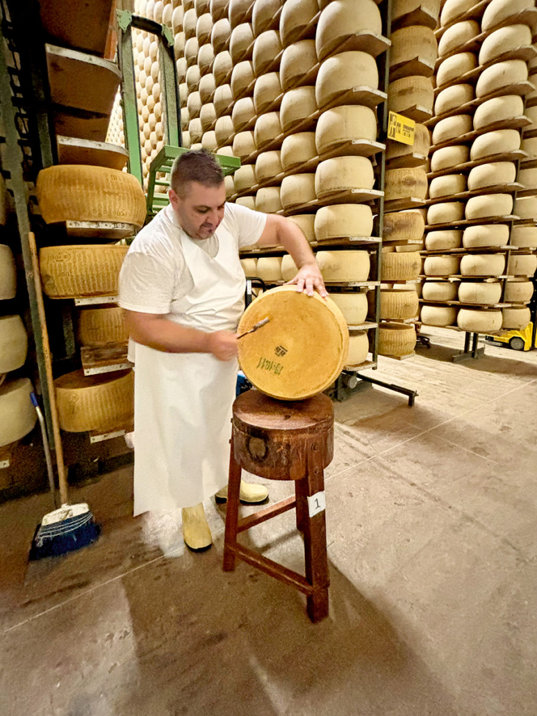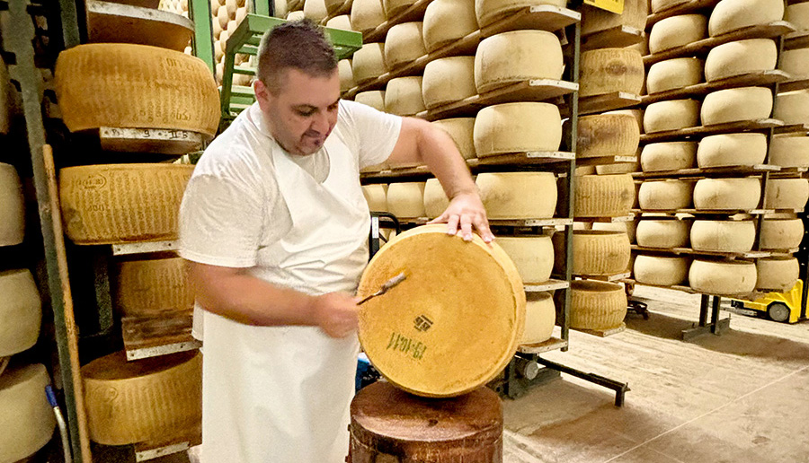 Juustomestari näyttää, miten consorzion tarkastajat tutkivat parmesaanikiekkoja naputtelemalla sitä erityisellä vasaralla ja kuulostelemalla kumahtelua. Tarkastuskäyntejä tehdään sekä sovitusti että yllättäen – kaiken on oltava juustokellarissa aina järjestyksessä.