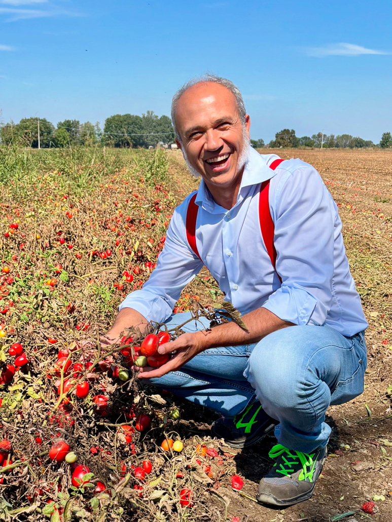Toimitusjohtaja Francesco Mutti tomaattipellolla.