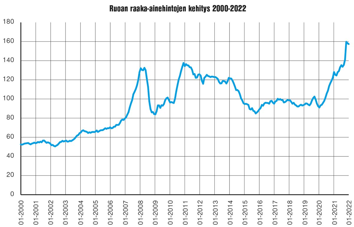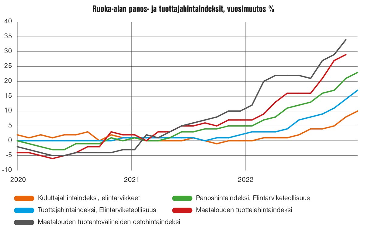– Viljan hinta on tuplaantunut vuodessa, naudanlihan tuottajahinta noussut 21, sialihan 25 ja siipikarjanlihan 31 prosenttia. Nämä ovat tosi isoja nousuja viime vuoteen nähden.