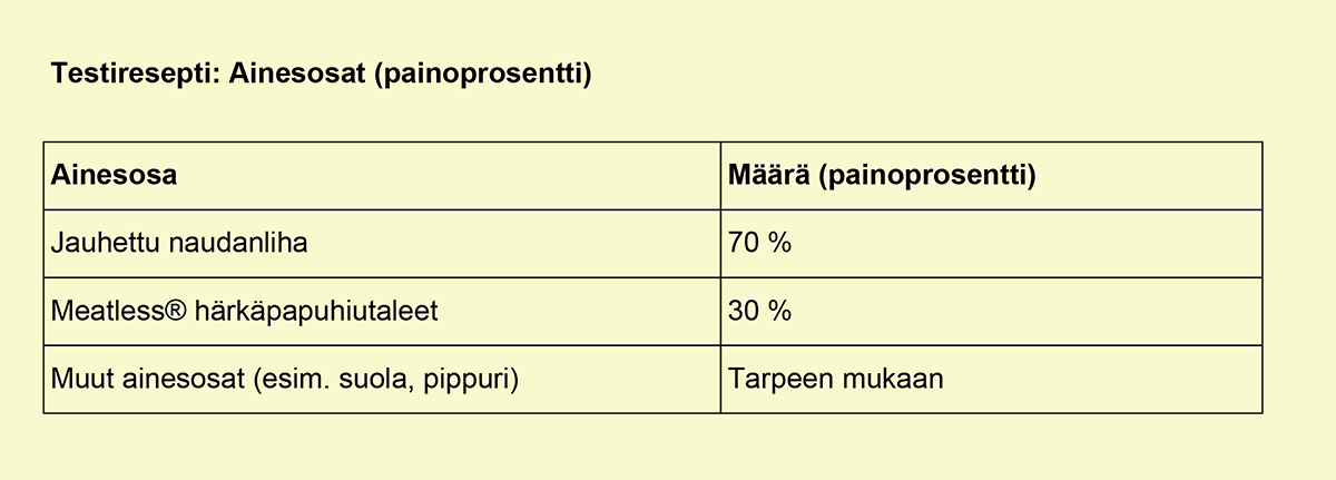 Tässä hybridihampurilaisreseptissä naudanlihan määrä on vähennetty 30 %, ja siihen on käytetty Meatless® härkäpapuhiutaleita. Lopputuloksena on kiinteä rakenne, mehukas tuote ja miellyttävä suutuntuma. Hiutaleet vähentävät rasvan ja kalorien määrää sekä voivat alentaa reseptin kokonaiskustannuksia merkittävästi. Ne on helppo integroida olemassa oleviin resepteihin ja tuotantoprosesseihin, ja niiden pakastus-sulatuskestävyys on erittäin hyvä.